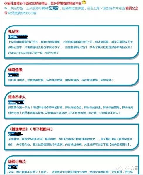 也就是一次性找6-10个粉丝差不多的同类微信账号,然后会有个组长负责协调。比如有什么1万组,3万组,然后组长会编辑一条内容,里面就是介绍参与互推的6-10个粉丝的介绍。然后大家在群发多条图文的时候,就会在其中一条里推送这个内容,从而达到了互推的效果。比如10粉丝的互推,相当自己的账号有机会获得100万粉丝的曝光,自然就能增加更多的粉丝。